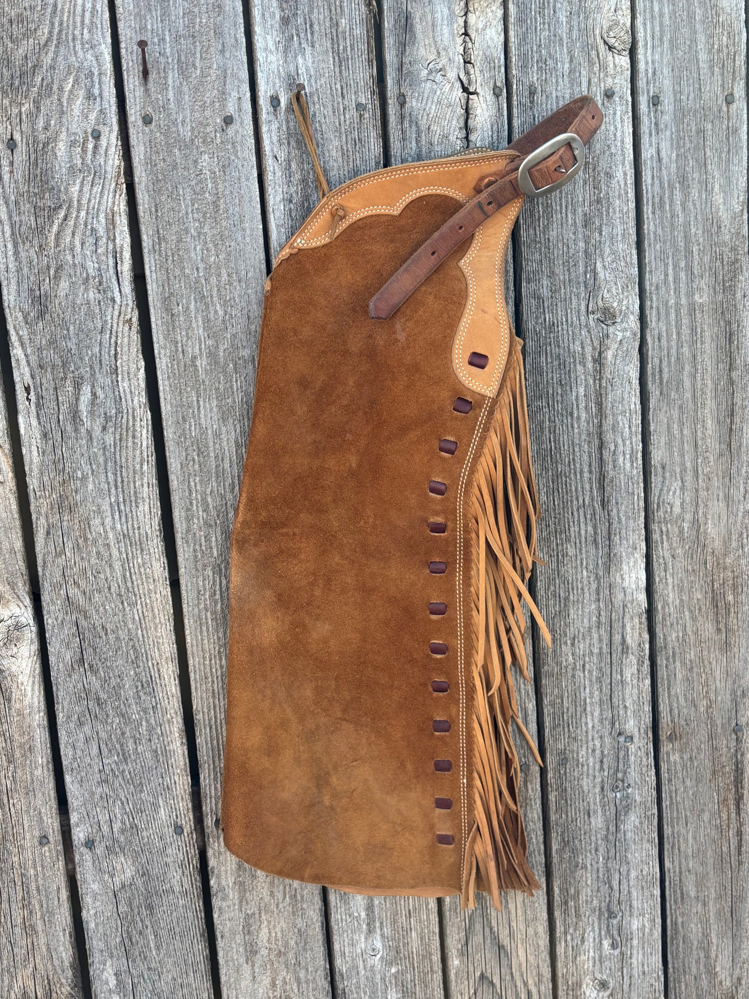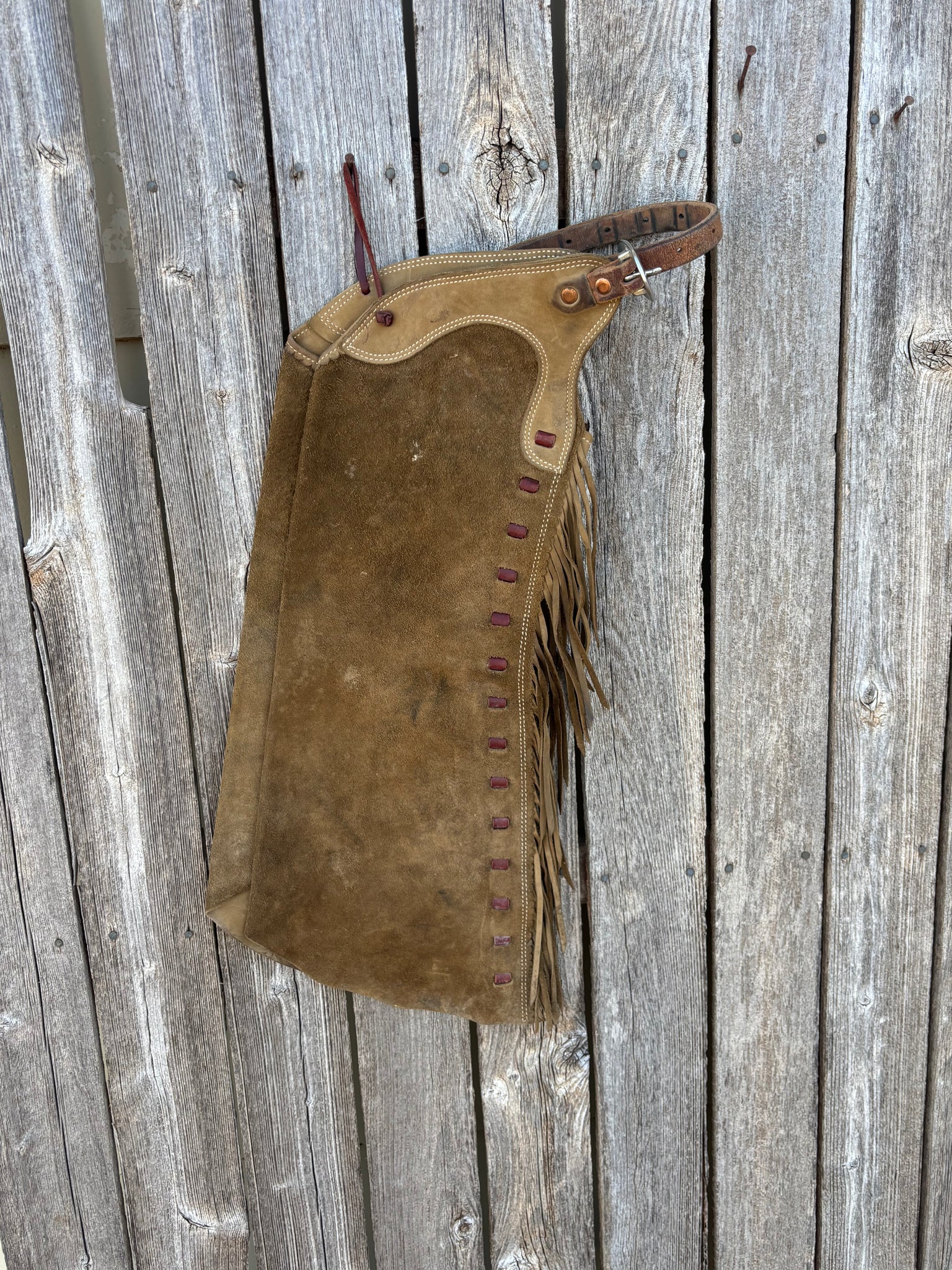 Used youth leggins. Rough out, step in. Tan and olive. 24” out seam 16” thigh