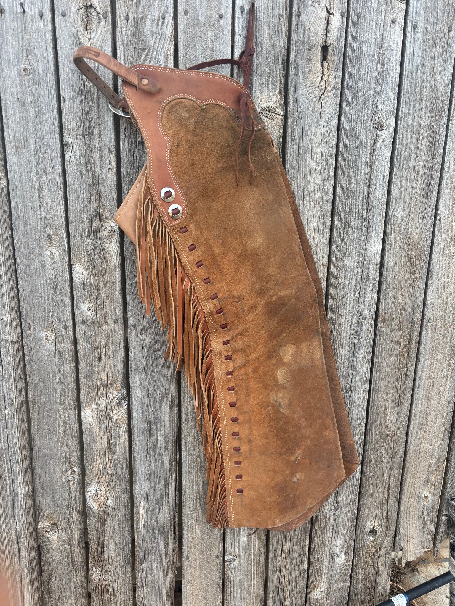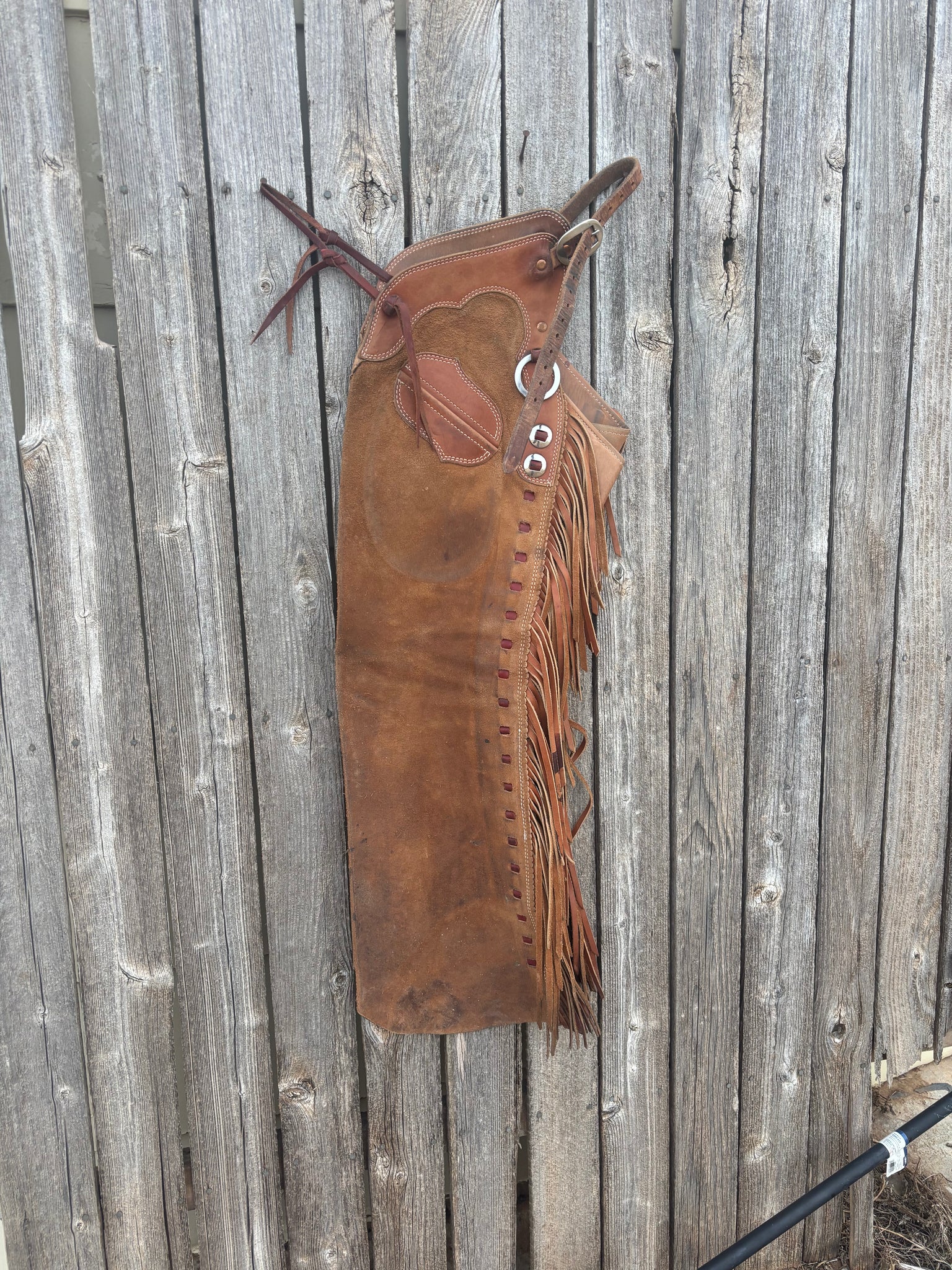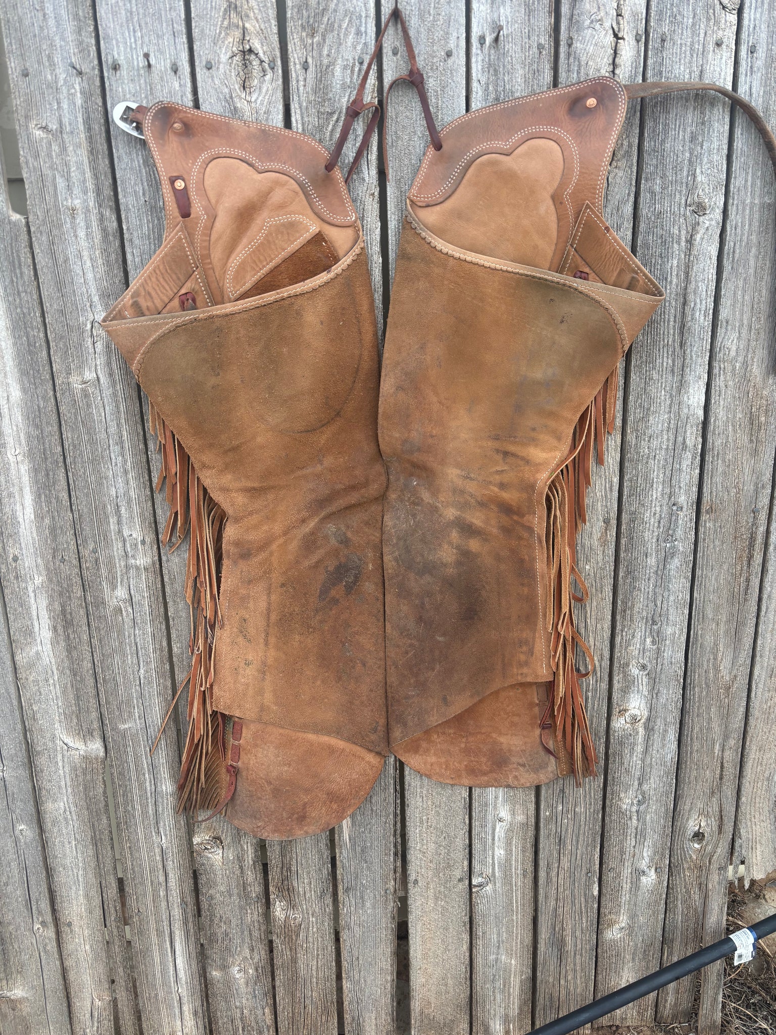 Used zippered bell leggins with left inside pocket. In good used condition with a small hidden patched area on left leg where 2 lace slots were torn. 10” bell25” thigh 37” out seam