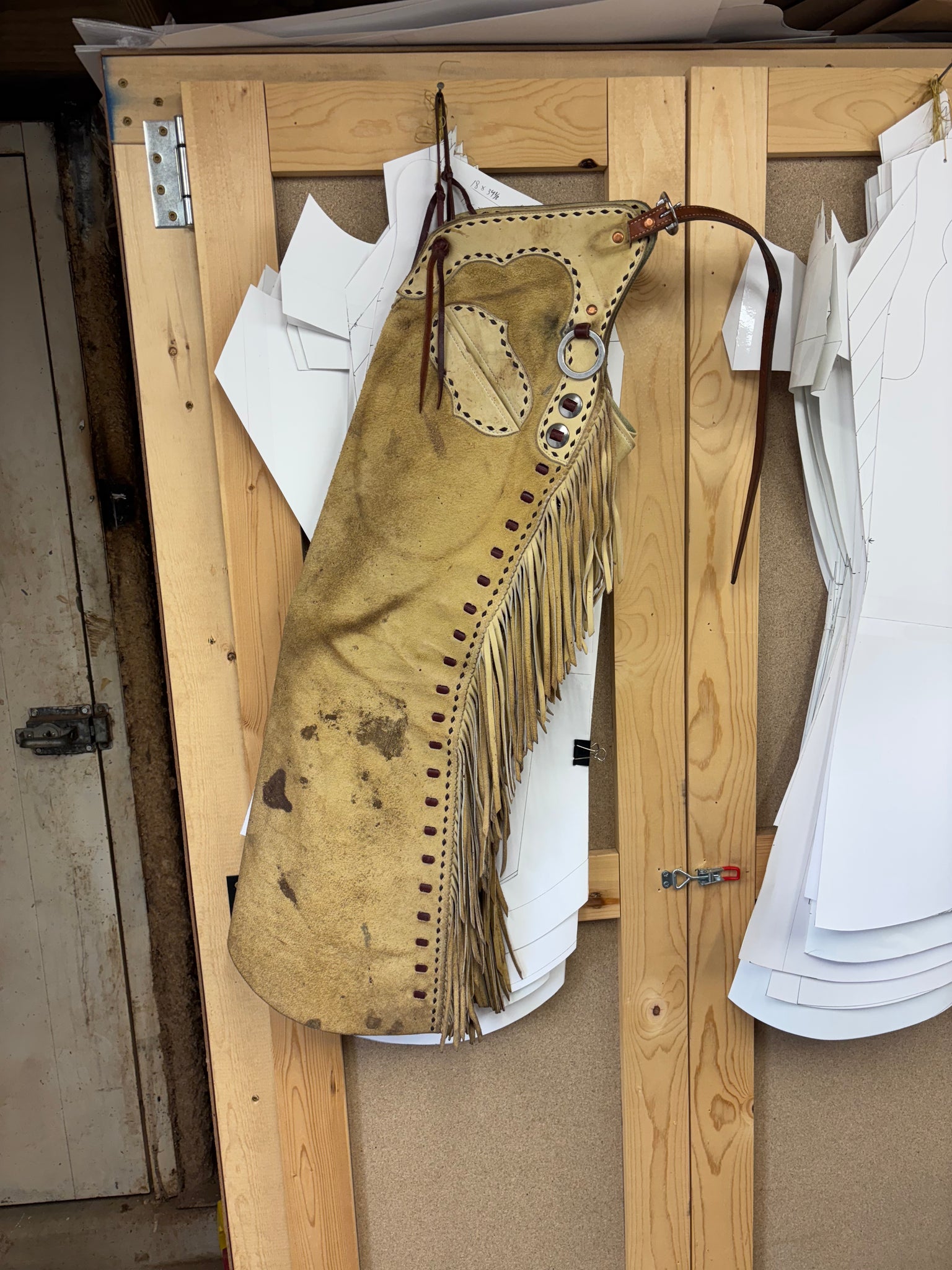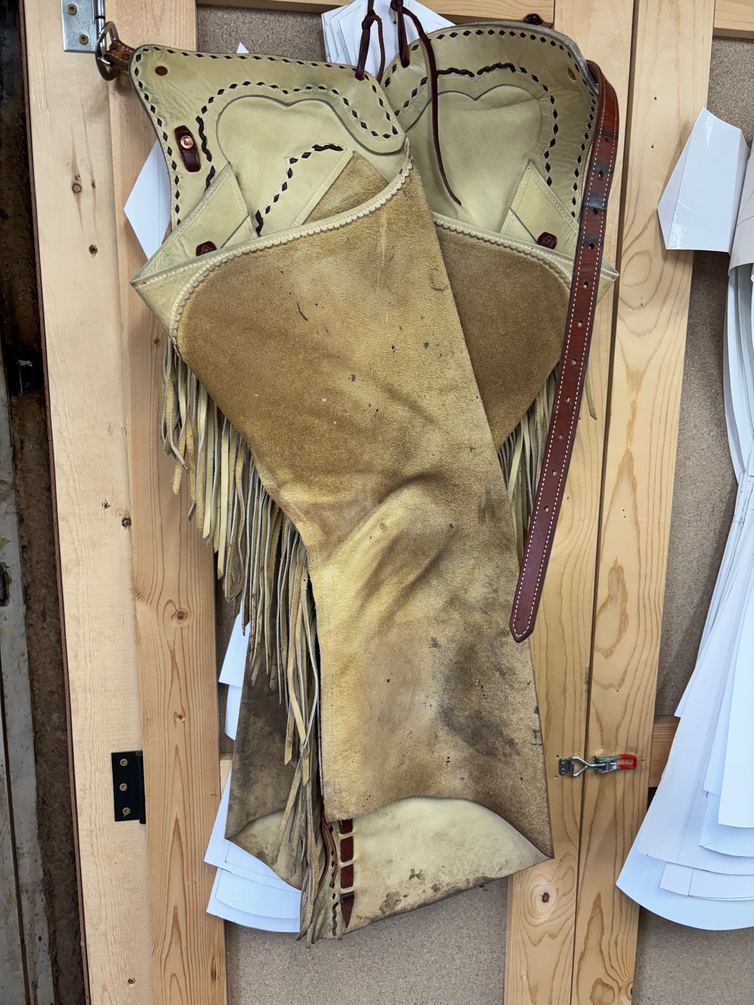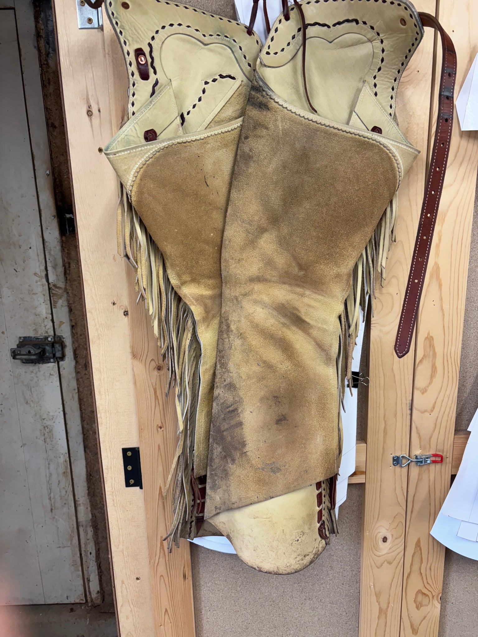4.5 oz buck tan zippered bells with burgundy kangaroo buck stitch and left inside pocket. 11.5” bell. Only a few months old. Dirty with mild regular wear
